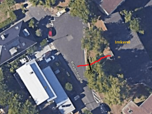 Weg von der Wendeplatte zur Imkerei.Blick auf die Imkerei. Das Tor ist normalerweise (leider) verschlossen. Den ZahlenCode findet ihr in der E-Mail, die wir euch zugeschickt haben.Direkt vor der Tür findet ihr den Honigschrank, mitsamt Zahlenschloss…tadaaaa – hier findet ihr alles, was ihr braucht!Ab sofort gibt es fast 24/7 die Möglichkeit, Honig abzuholen. Und zwar im praktischen, neuen Honigschrank, direkt neben der Eingangstür unserer Imkerei! Eine zeitliche Einschränkung gibt es leider – der Hausmeister der Schule bittet uns, Montag bis Mittwoch erst ab 15 Uhr zur Abholung zu kommen. An allen anderen Tagen könnt ihr kommen, wann ihr möchtet. Den Zahlencode für den Schrank und für das Metall-Tor findet ihr in der Mail, die wir euch dazu geschickt haben. Auch in der Signal-Gruppe stehen die Codes. Wenn ihr Probleme habt, den Weg zu finden, meldet euch bitte!