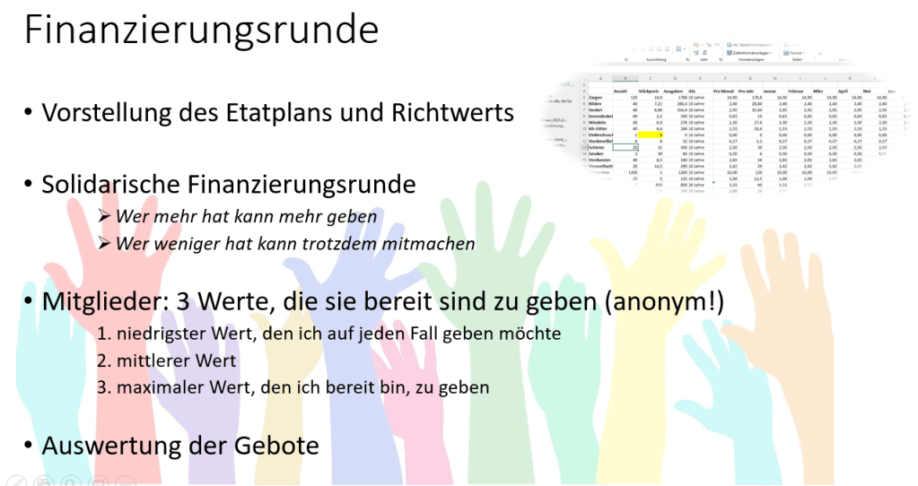 In „abgespeckter“ Version kann die Finanzierungsrunde auch per Mail durchgeführt werden. Dabei senden die Mitglieder in einer Mail drei Beträge, die sie bereit sind zu geben. Jeder Wert stellt also eine Bieterunde dar. In der Auswertung werden die Runden nacheinander ausgezählt. Es wird dann die Runde herangezogen, mit der das Gesamtbudget erreicht wird.