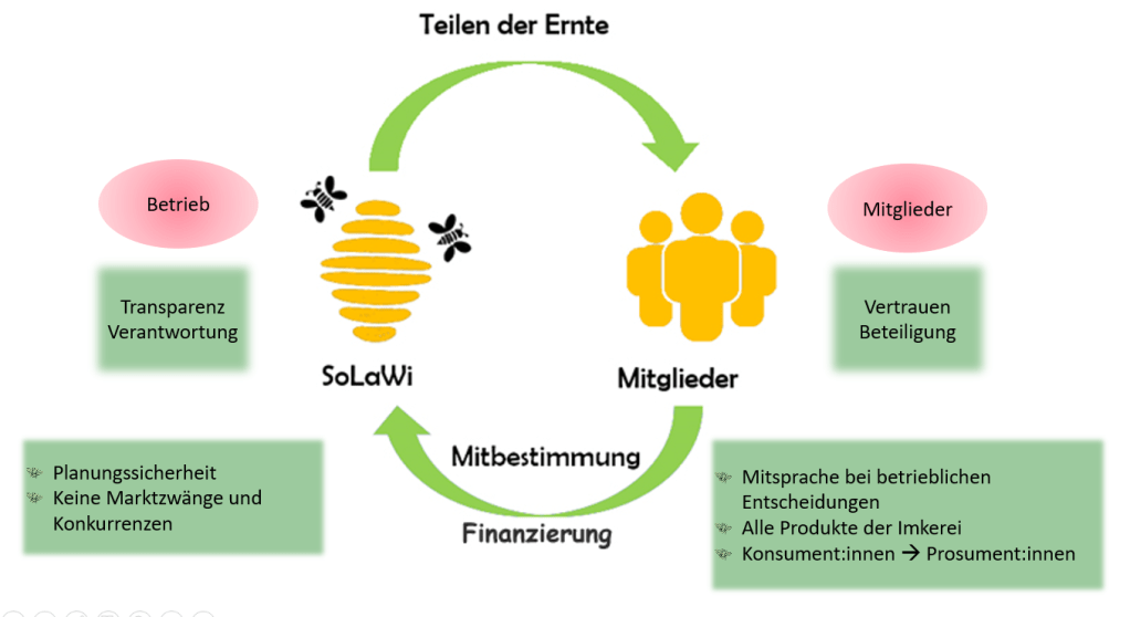 Mitglieder werden so von entfremdeten Konsument:innen zu Prosument:innen, die die Herkunft der Produkte kennen, Vertrauen in die Produzent:innen haben und ein Verständnis für die Lebensmittelproduktion und den Einfluss auf die natürliche Umwelt entwickeln. Außerdem können die Mitglieder Wünsche und Anregungen an die Imkerei herantragen – etwa in Bezug auf die Betriebsweise oder ob sie lieber mehr Honigmet und weniger Honig beziehen möchten. Dafür möchten wir einen regelmäßigen Raum für Austausch und gemeinsame Entscheidungen schaffen.